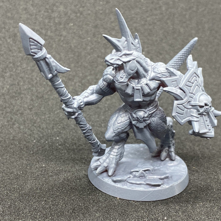 El Guerrero Hombre Lagarto Fauces Doradas es un feroz cazador de la jungla, conocido por su destreza marcial y su destreza. Equipado con armas intercambiables, se erige como un oponente formidable en cualquier encuentro de rol de mesa. Estos guerreros hombres lagarto son expertos en usar su entorno natural y sus habilidades de combate táctico para dominar su territorio.