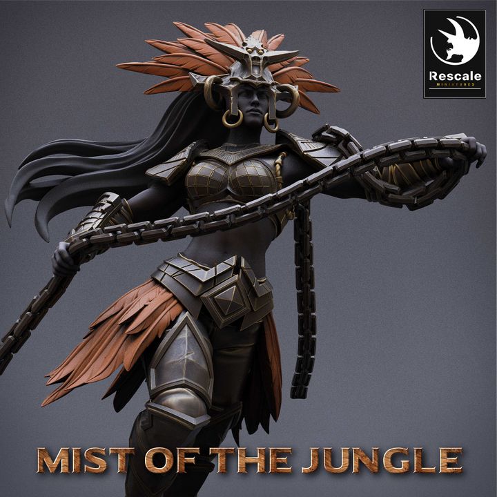 This model depicts a powerful Amazon warrior, poised in motion, wielding a massive chained weapon. Known for their strength and combat prowess, Amazons are formidable combatants in any jungle scenario. The detailed armor and dynamic pose highlight the warrior's agility and strength, capturing the essence of jungle warfare.