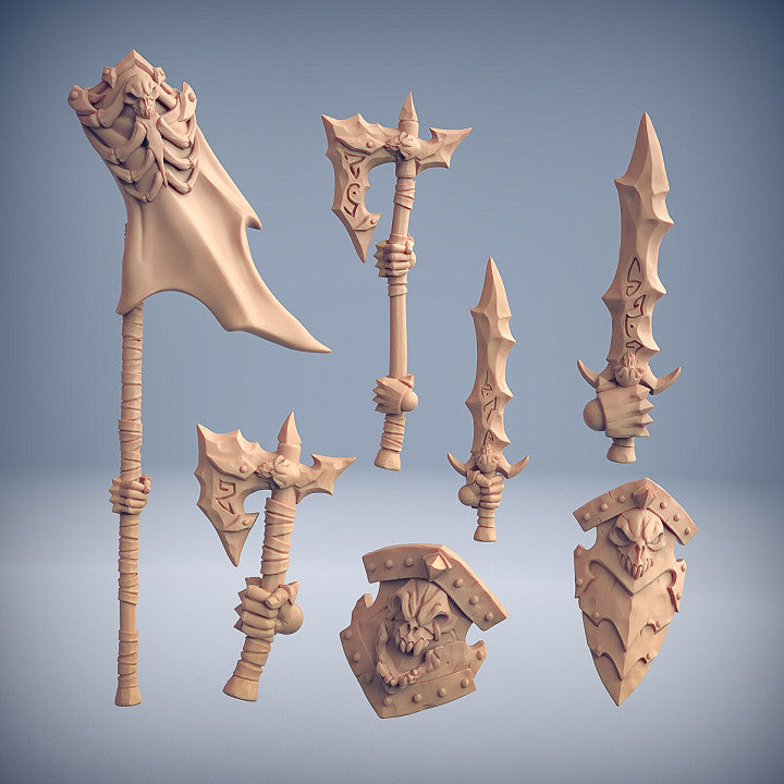 This model depicts a powerful female Orc from the Frostmetal Clan, known for their control of necromantic arts and fearsome combat skills. The Orc is equipped with interchangeable weapons, including an axe, great axe, sword, broadsword, shield, and banner. These fierce warriors have sworn to protect the temple of Ferocity and boast black metal armor reinforced with bones. The intricate details highlight the might and resilience of these battle-hardened warriors.