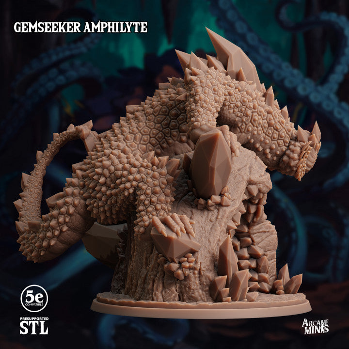 This model features the Gemseeker Amphilyte, a creature inspired by magical realms rich in gemstones. Its body is covered in crystalline protrusions, providing it with natural armor. The Amphilyte's stance and detailed finish make it an impressive addition to any tabletop adventure.