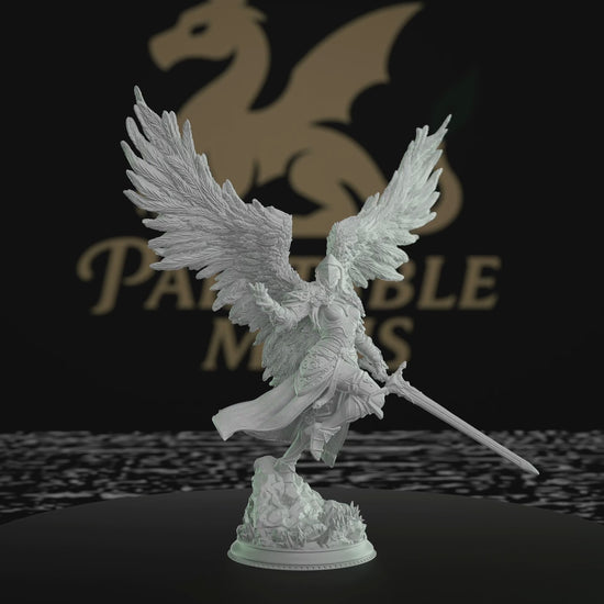 This majestic miniature depicts a winged warrior poised for battle, with intricately detailed armor and expansive wings. Ideal for D&D and Pathfinder, this model is perfect for tabletop RPG enthusiasts and miniature painters. Standing at 70mm tall, it makes a striking centerpiece for any campaign or collection. Its dynamic pose captures the essence of a formidable guardian, ready to defend against any foe.