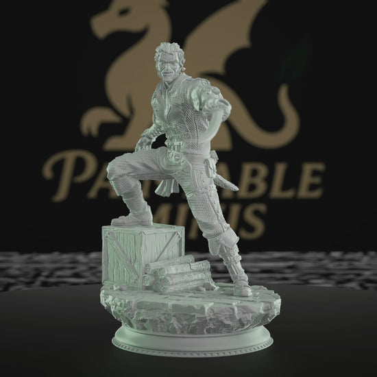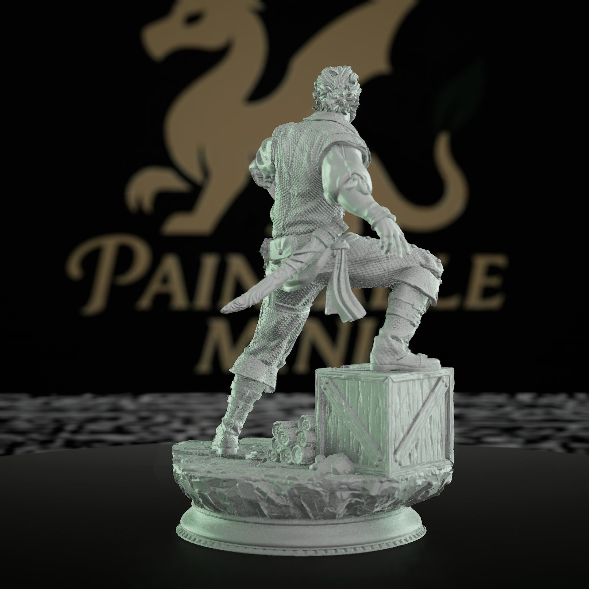Rossa Cartel Enforcer Miniature | This D&D miniature features a rugged street enforcer, embodying the tough muscle of a feared cartel. Ideal for tabletop RPGs, the figure displays meticulous detail with a dynamic pose over a rugged terrain base. Designed for hobbyists and gamers, it offers an immersive addition to your campaign or display. Perfect for painting, it captures a gritty, city environment essence.