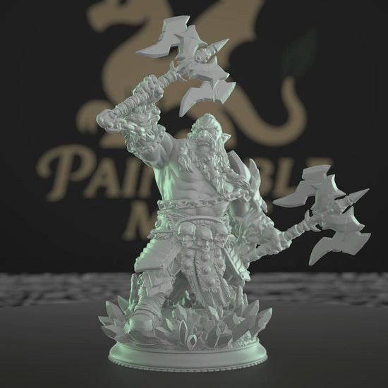 This formidable Dark Dwarf Champion Miniature is perfect for D&D enthusiasts. Standing with a dual-bladed axe and clad in intricate armor adorned with skulls, its dynamic pose adds intensity to your tabletop RPG adventures. The model is designed with high-detail features suitable for hobbyist painters aiming to bring life to their campaigns. Printed at a medium scale, it's an ideal addition to any collection for display or interactive gameplay.