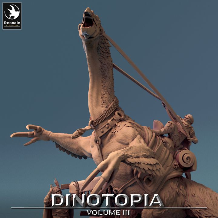 This model features a Therizinosaurus, a dinosaur known for its impressive claws and herbivorous nature. These creatures are often depicted in fantasy as both majestic and formidable beasts. The detailed design includes intricate layering of feathers and a dynamic pose that captures the essence of this prehistoric creature.