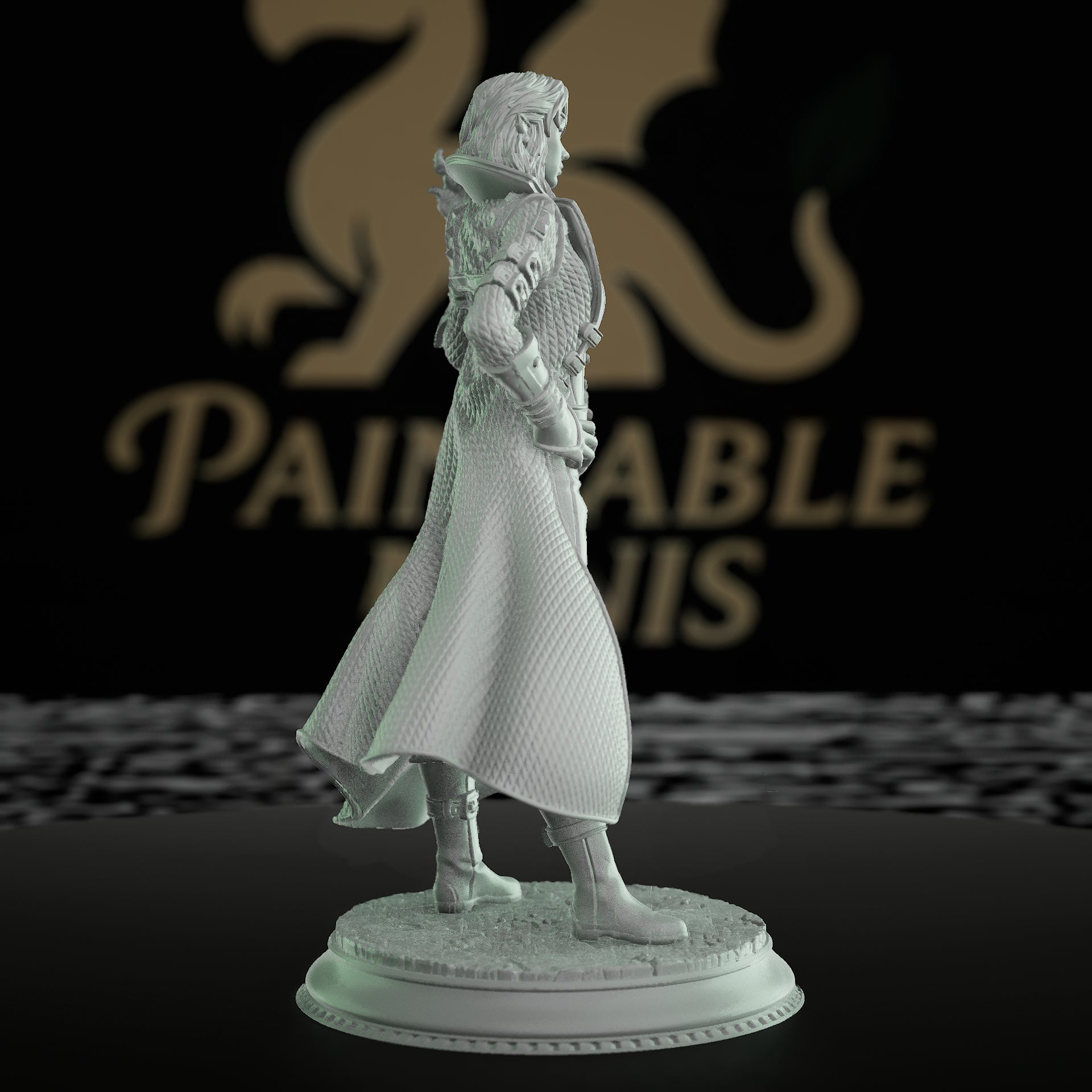 This Dungeons and Dragons miniature depicts a charismatic spellcaster with a flair for intrigue and magic. The model features detailed clothing, including a long coat and intricate accessories, perfect for tabletop RPG adventures or display. The pose exudes confidence and readiness, making it an ideal piece for hobbyists and collectors. Printed in high-quality resin, this figure showcases exquisite detailing for painting enthusiasts.