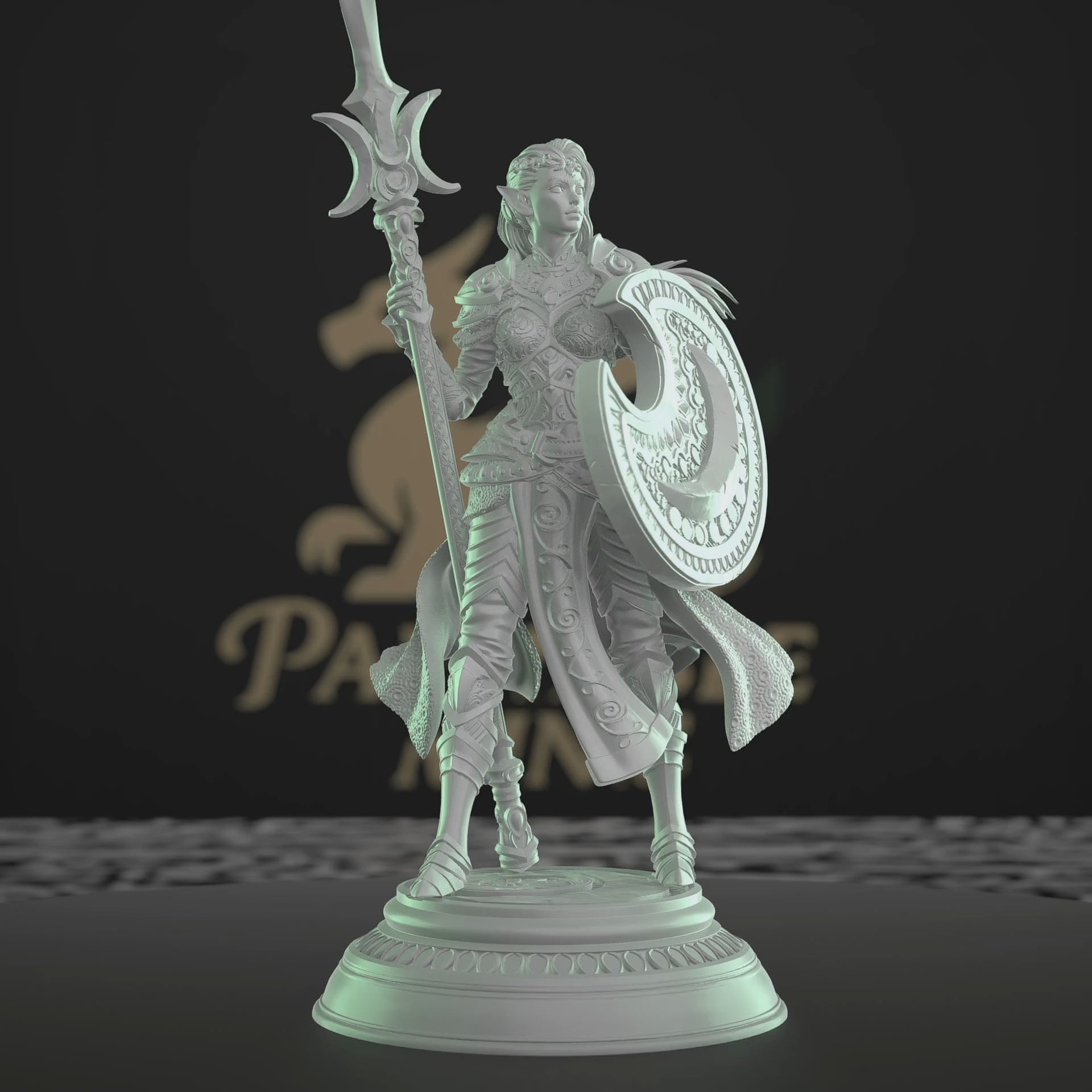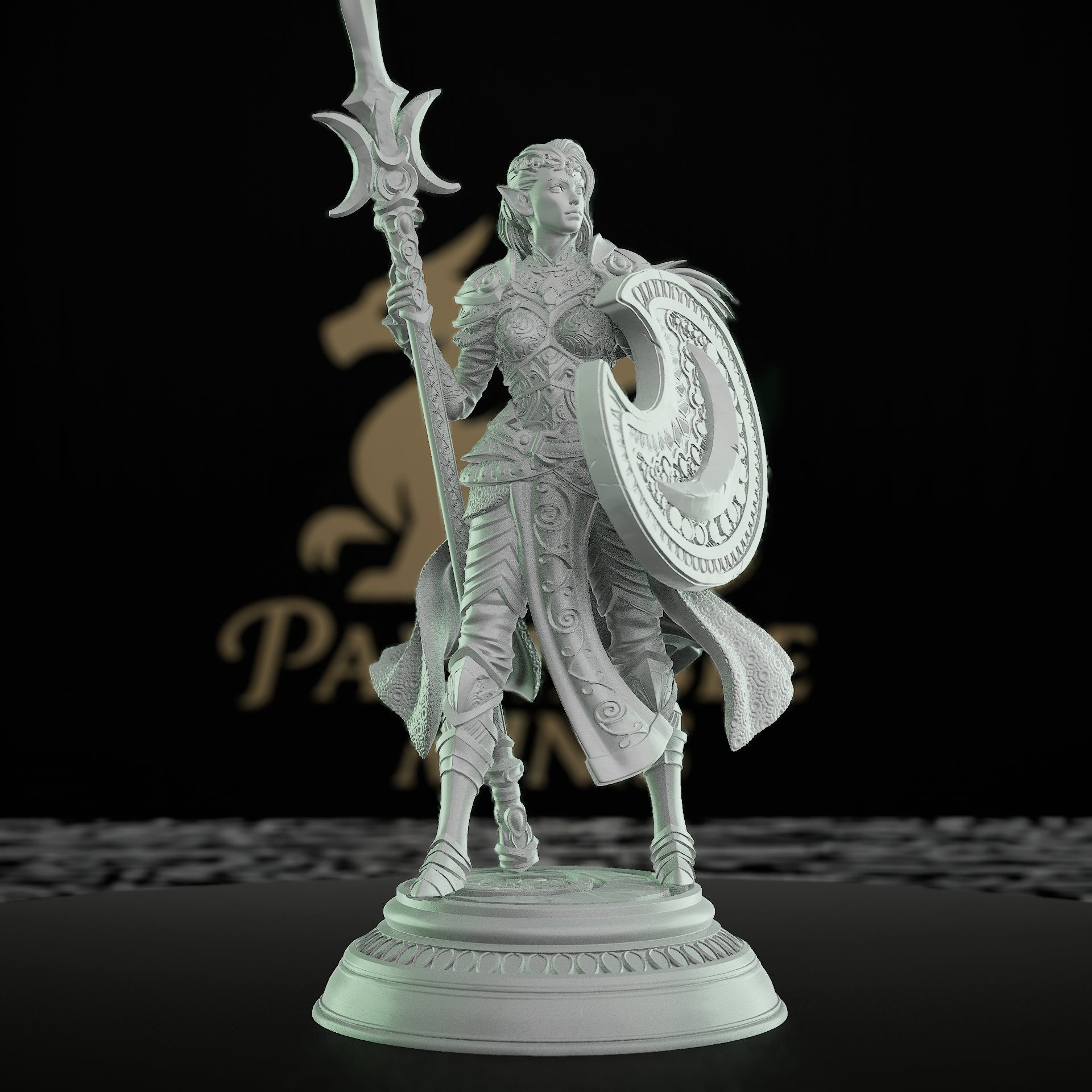 Ninera, the Half-Drow Cleric Miniature, stands poised with a detailed crescent shield and an ornate staff. Her intricate armor and defined features make this mini ideal for D&D enthusiasts or hobbyist painters seeking a high-quality piece. This medium-sized model is perfect for tabletop RPGs, offering both a unique narrative presence and a rewarding painting experience. Crafted by DM Stash, it represents a captivating addition to any collection.