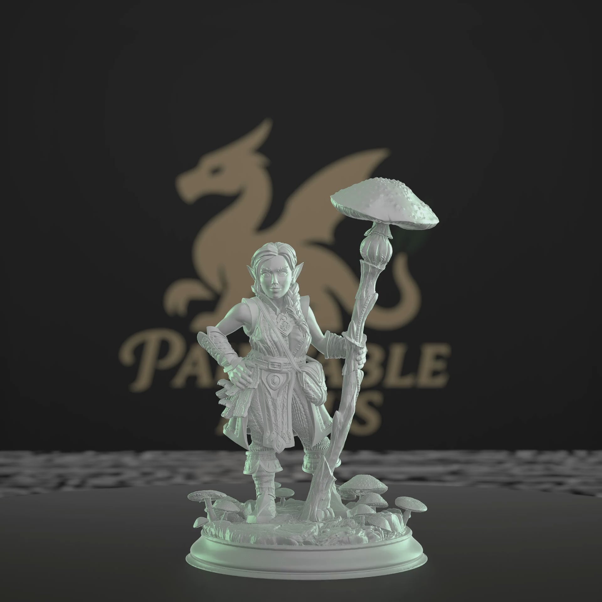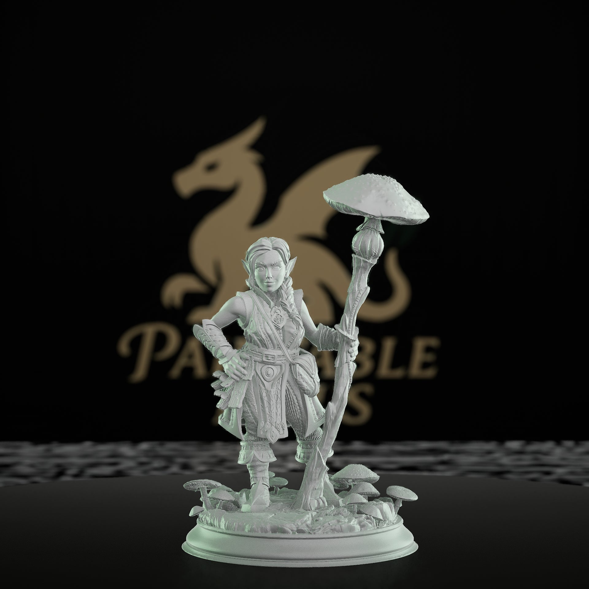 A detailed Spore Druid miniature for tabletop RPG enthusiasts, featuring intricate clothing and a nature-themed staff topped with a mushroom. Ideal for D&D and Pathfinder games, this model captures the essence of a druidic character deeply connected to the forest. The figure stands amidst detailed mushroom bases, enhancing the forest atmosphere. Perfect for painters seeking to bring out the vibrant potential of its design.