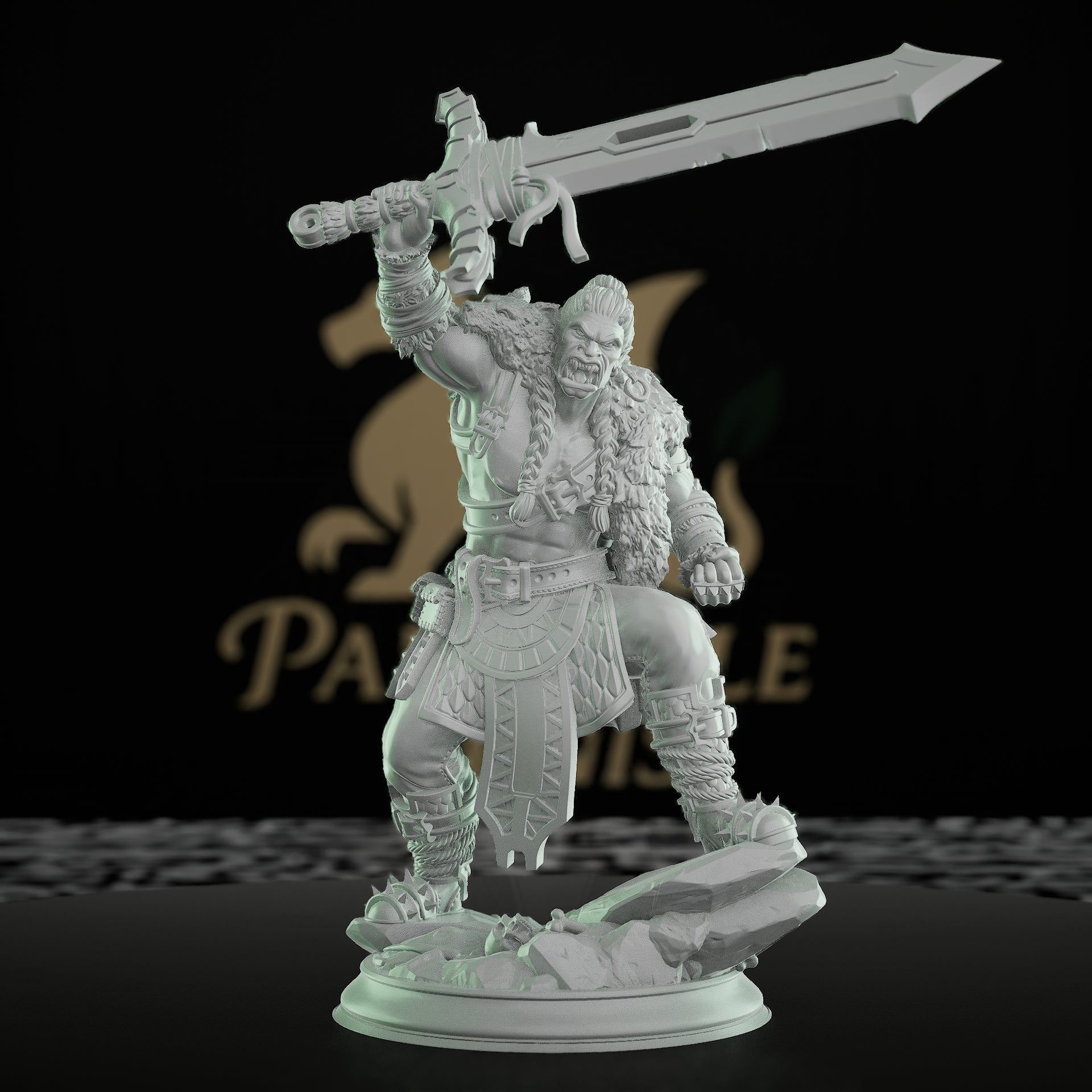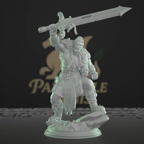 A half-orc barbarian warrior stands poised with a massive sword, ready for battle. This detailed miniature features intricate armor and a rugged fur cloak, capturing the essence of a fierce survivor. Ideal for tabletop RPG gamers and painting enthusiasts, this model enhances any fantasy setting. Perfect for Dungeons and Dragons or Pathfinder campaigns, it offers a dynamic addition to your character collection.