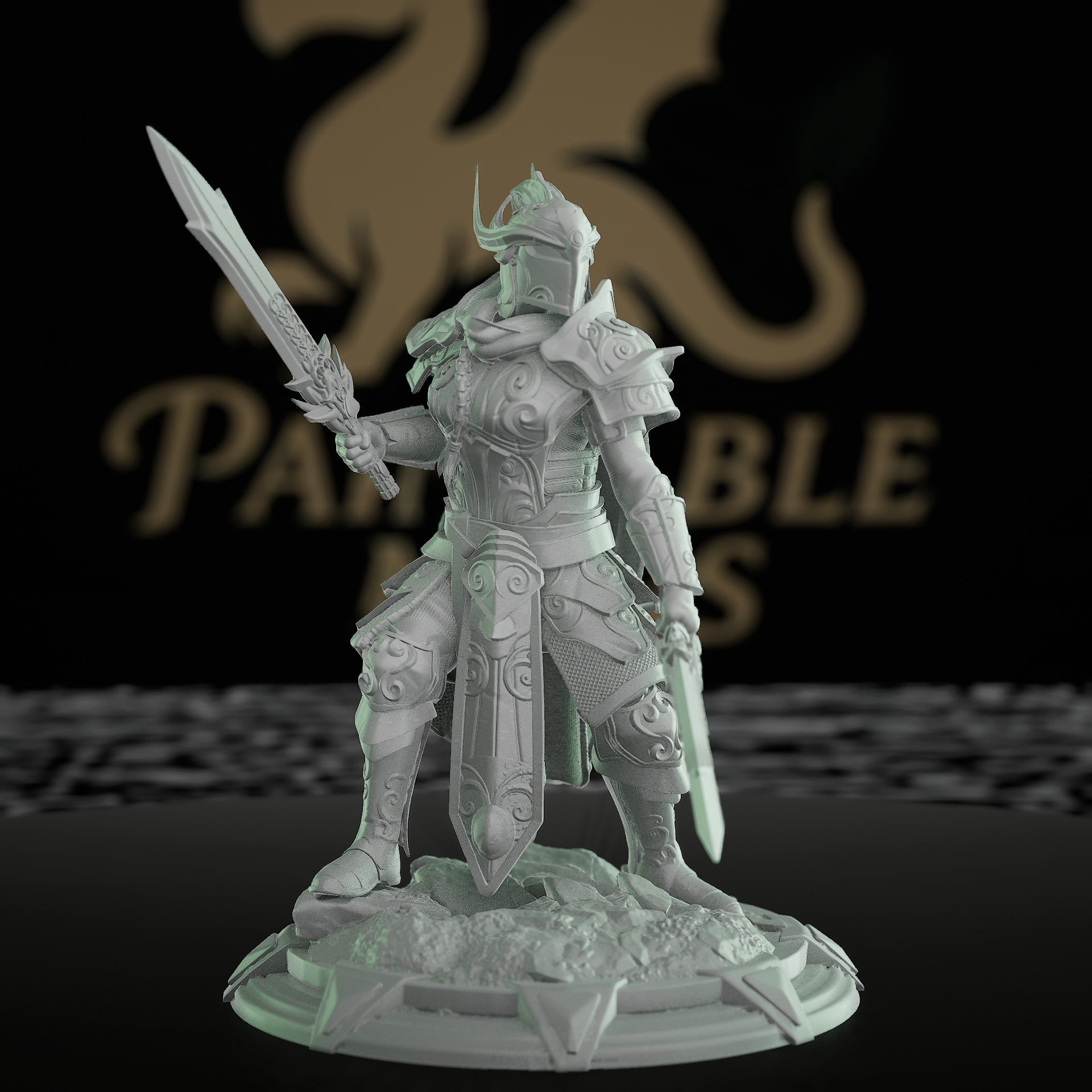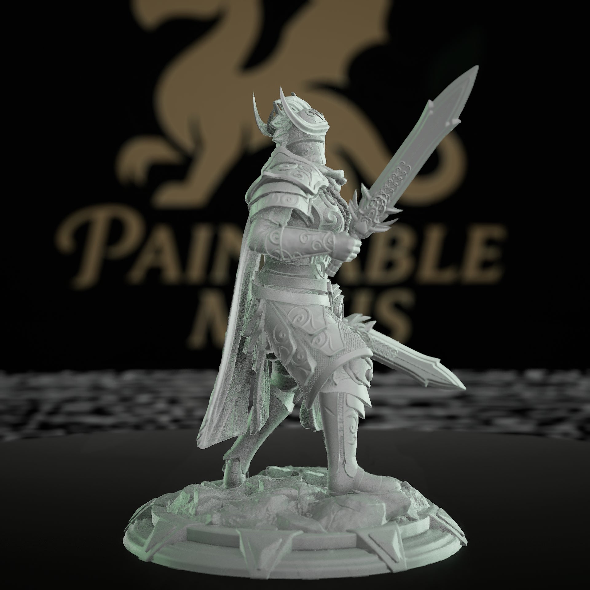 The Vanguard soldier is a striking figure clad in exceptional plate armor, showcasing intricate detailing that reflects a strong military aesthetic. With a sword at the ready, this miniature embodies the resilience and valor of the Elven forces, perfect for tabletop RPGs and painting enthusiasts. The raised cape and dynamic pose add an element of movement and heroism, making it a standout piece for any collection. Designed by DM Stash, this medium-sized model is ideal for representing a valiant warrior on your tabletop adventures.