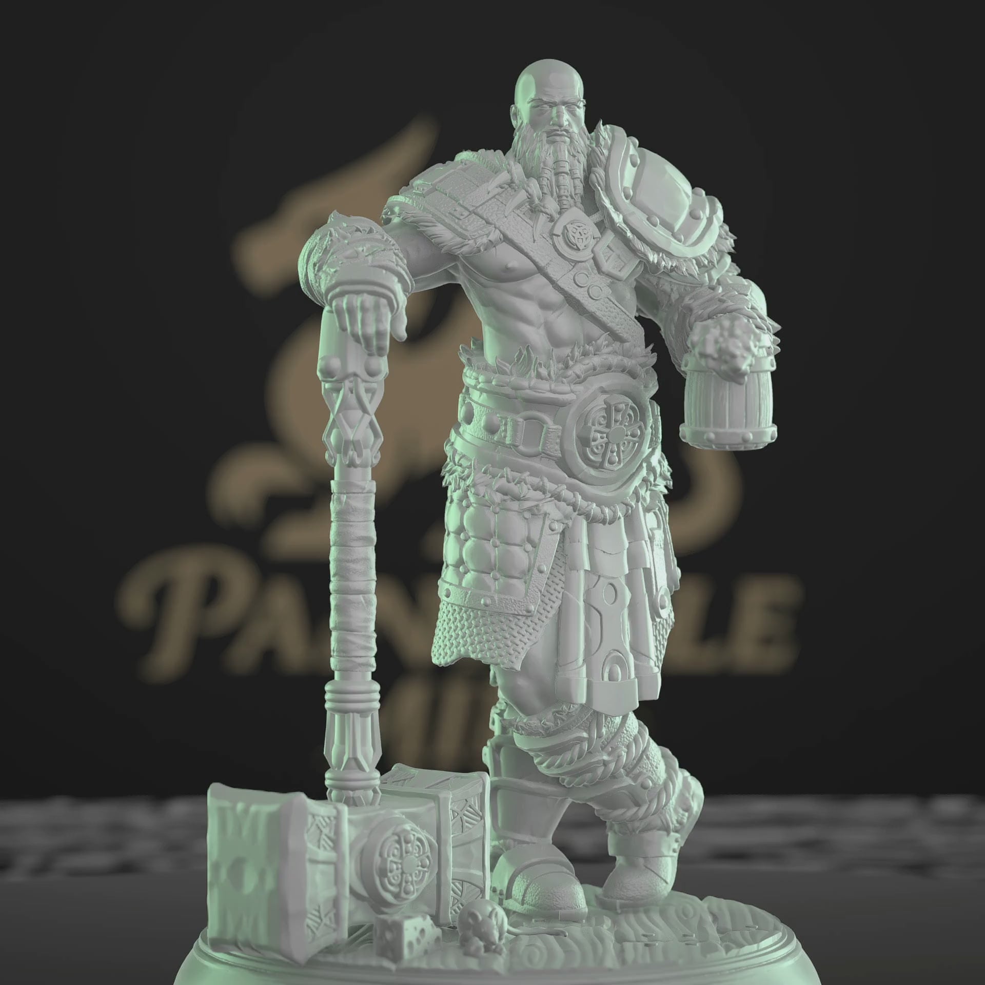 The model depicts a rugged warrior mercenary with intricate armor details, holding a massive hammer and a tankard. The miniature exudes strength and readiness for battle, ideal for showcasing storytelling elements in your RPG campaign. Designed with attention to detail, it offers a dynamic pose, perfect for both gameplay and display. Ideal for tabletop RPG enthusiasts and miniature painters seeking a unique addition to their collection.