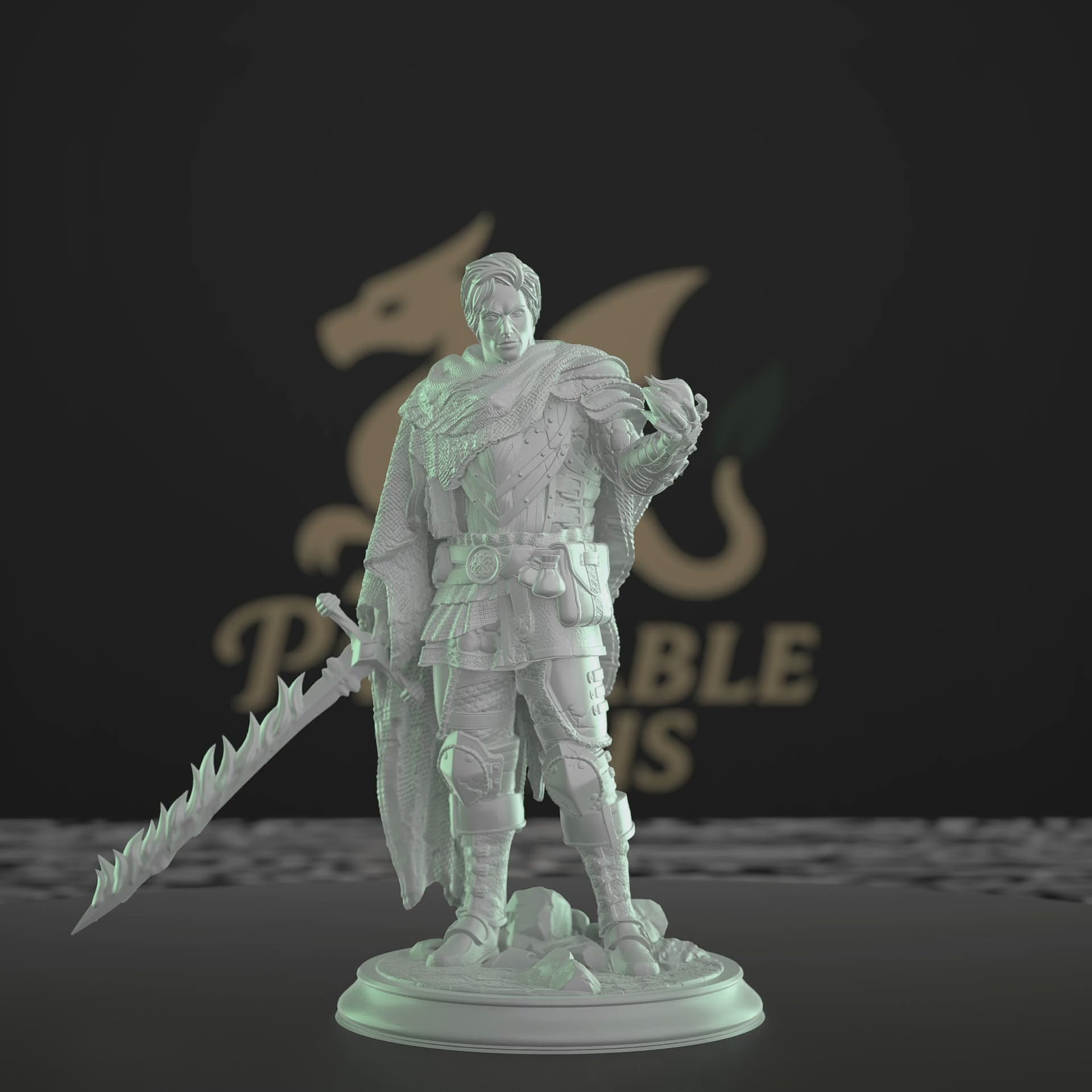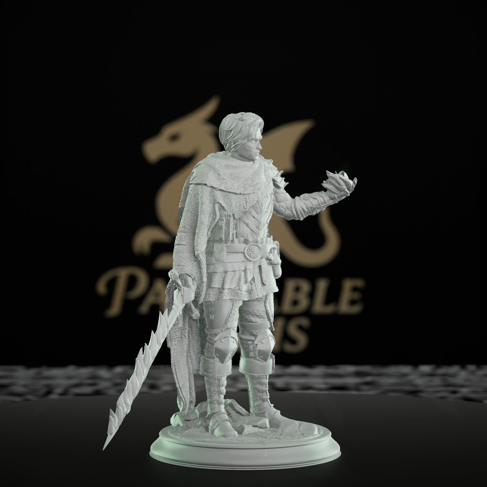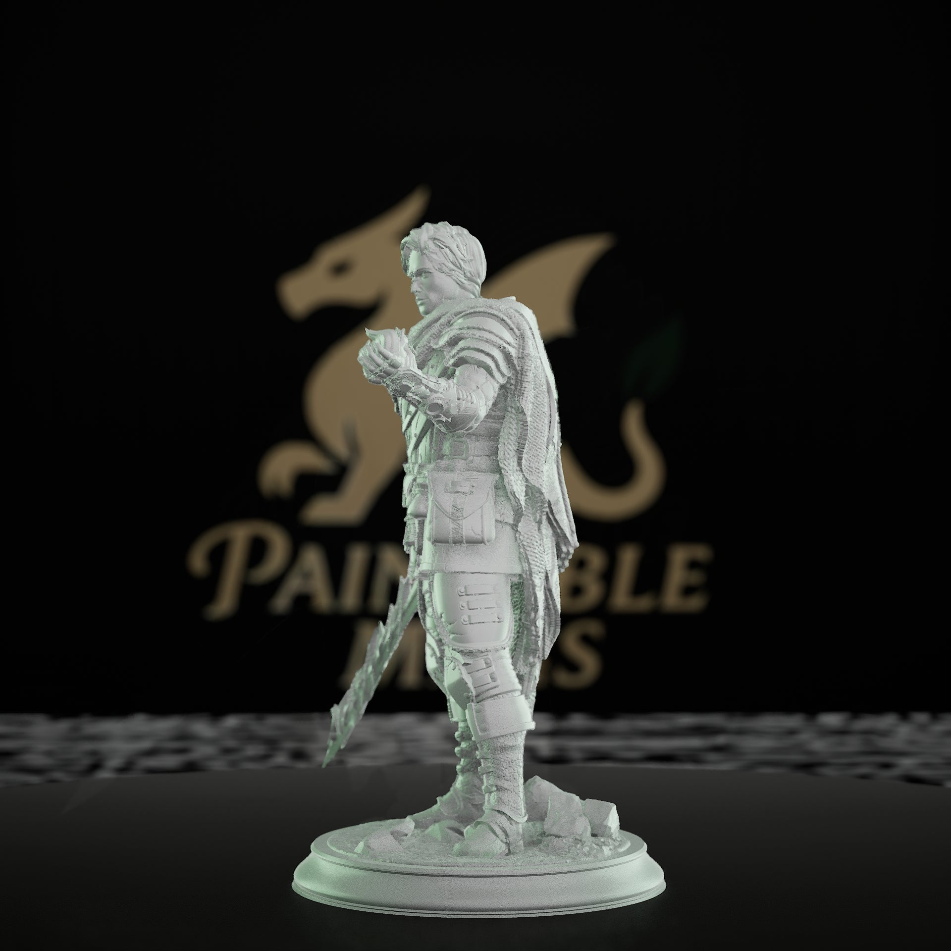 [This warrior miniature is intricately detailed, featuring a rugged cloak and intricate armor perfect for RPG enthusiasts. Holding a mysterious orb, he stands poised with a formidable, spiked sword, drawing attention to his commanding presence. The model is designed by DM Stash, ensuring high-quality craftsmanship ideal for tabletop and painting hobbyists. Its medium size makes it a versatile addition to any Dungeons and Dragons or Pathfinder collection, ready to enhance your gaming experience.]