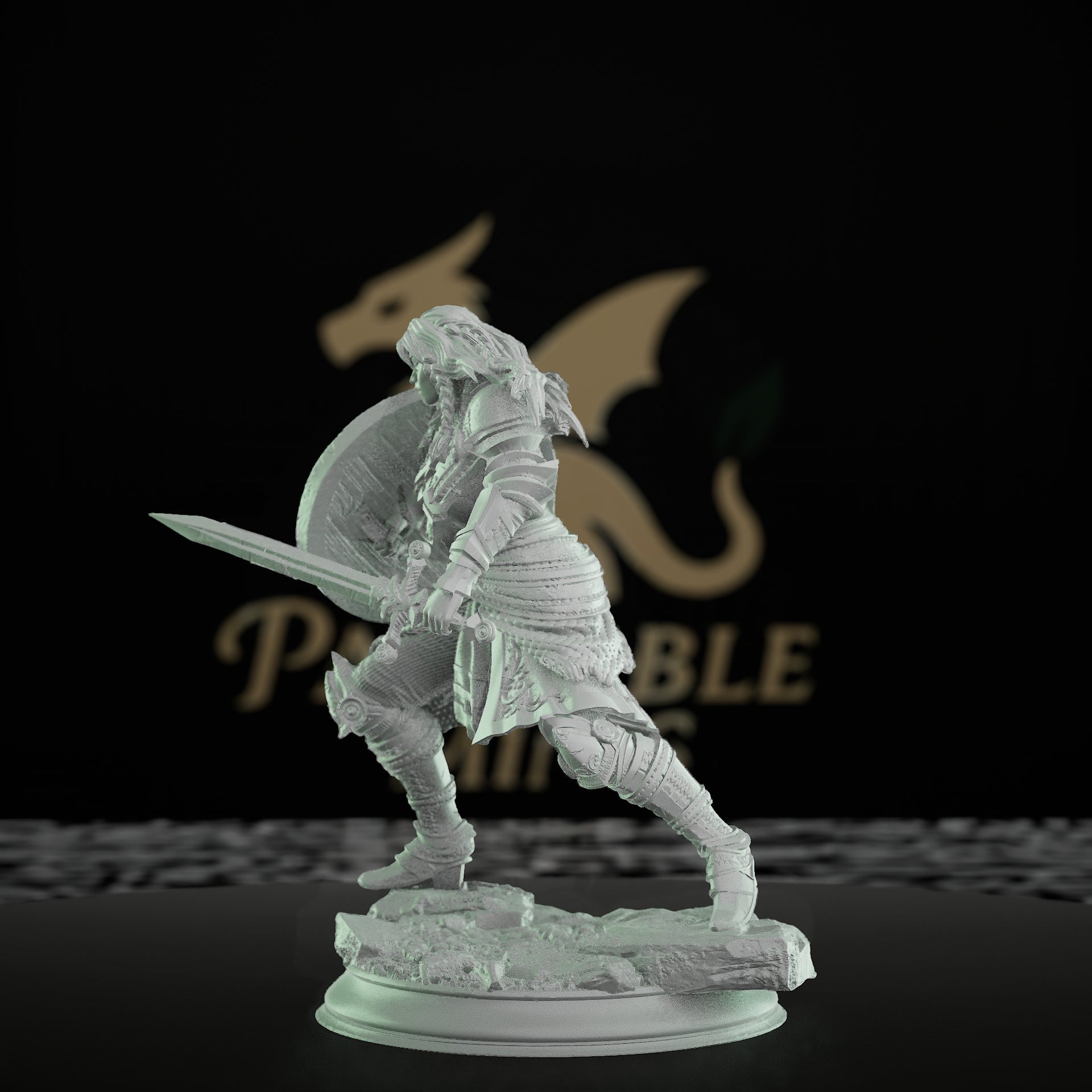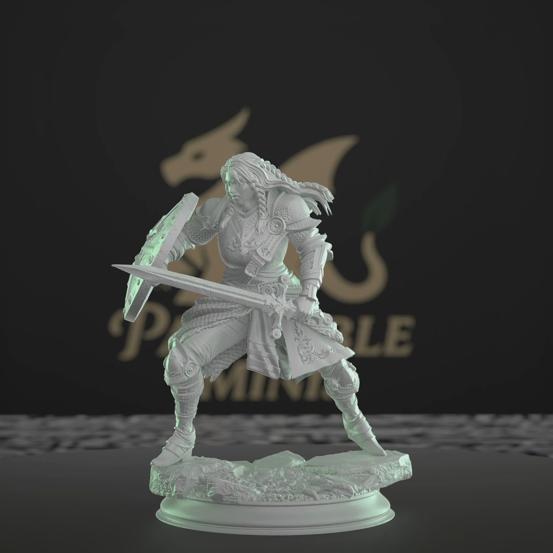 Jorjie, the Shieldmaiden Miniature captures a warrior in a dynamic combat-ready pose. She wields a detailed sword and shield, embodying strength and valor. Perfect for tabletop RPGs or as a display piece, this medium-sized model is intricately designed with fine armor and braided hair. Ideal for both hobby painters and D&D enthusiasts seeking a fierce character for their campaigns.