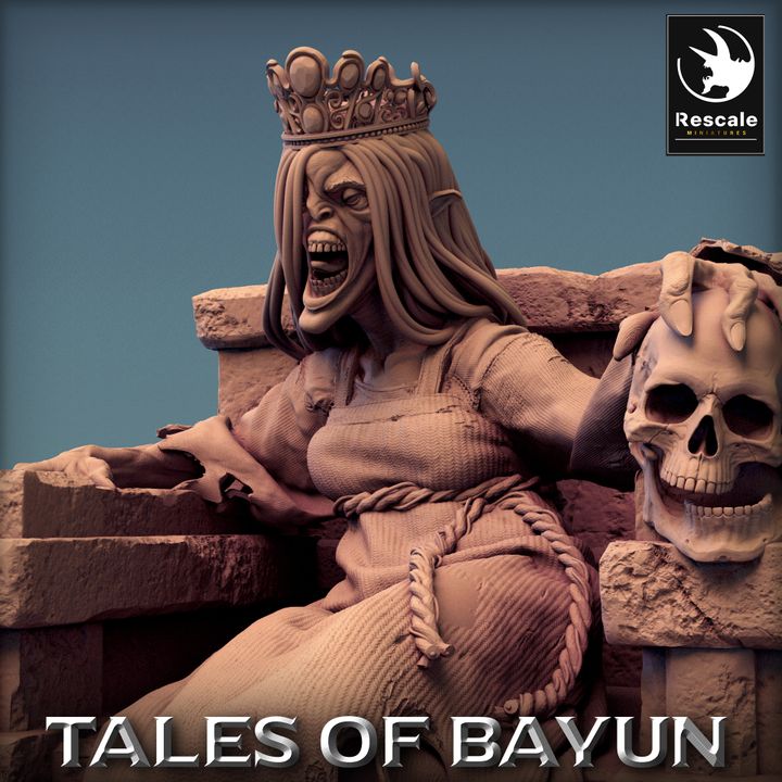 This model portrays a Kikimora Princess Queen seated on a throne surrounded by bones and skulls. Kikimoras are often depicted as malevolent spirits from Slavic folklore that bring misfortune. The throne is richly detailed with skeletal remains, enhancing the eerie presence of this mysterious figure.