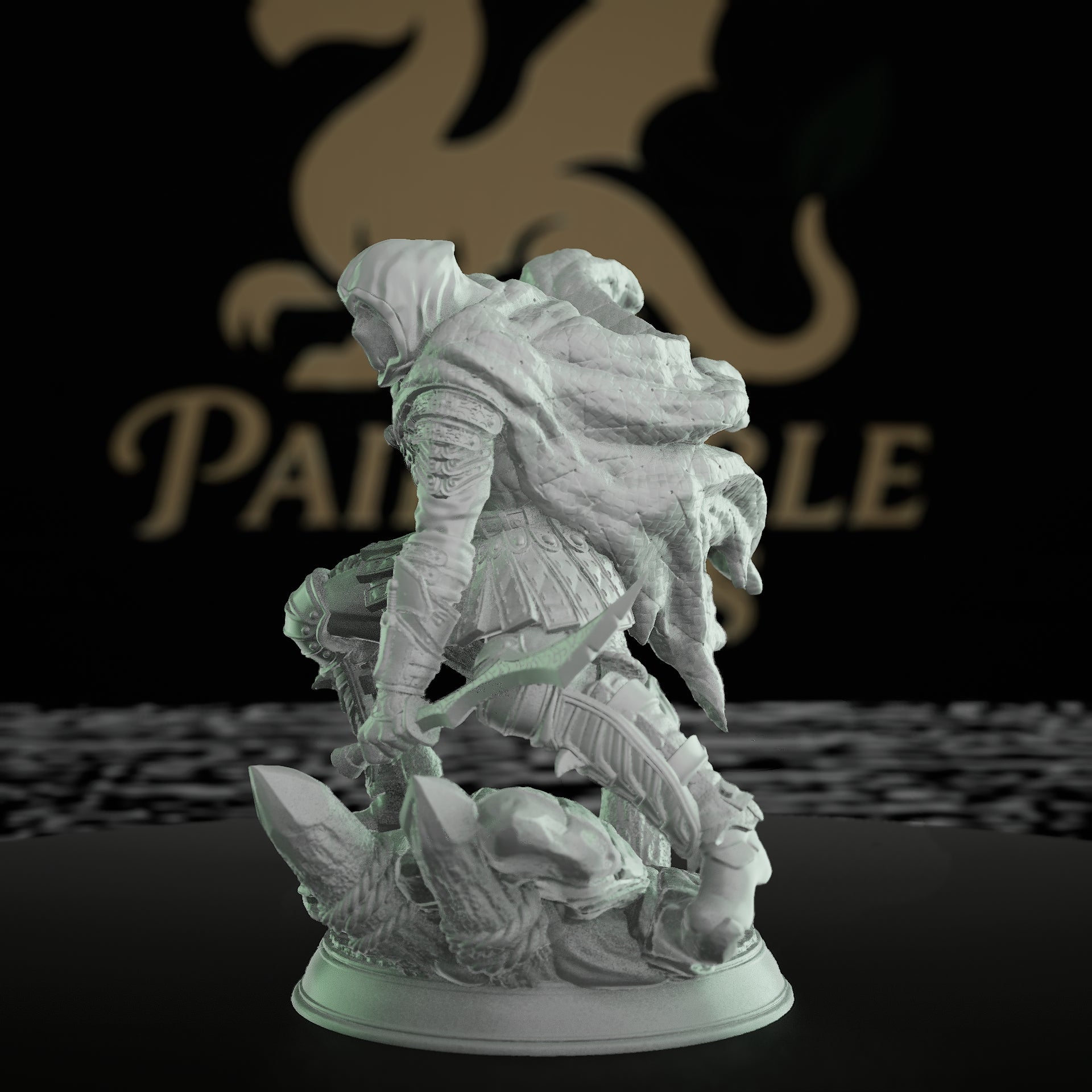 An enigmatic figure poised for stealthy combat, this medium-sized miniature depicts an assassin ready to strike. With intricate armor details and a menacing hooded cloak, it is perfect for RPG games and painting enthusiasts. The model stands dynamically on a rocky base, showcasing its agility and lethal intent. This figure is ideal for D&D, Pathfinder players seeking a unique character piece.