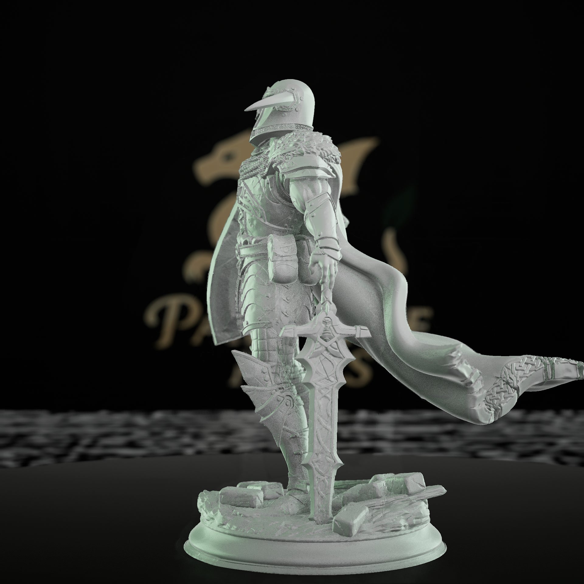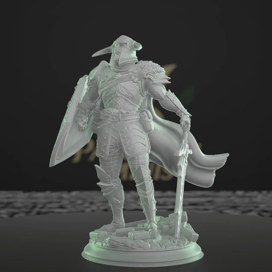 This meticulously crafted model depicts a warrior clad in intricately detailed armor, wielding a large shield and helm. The character's dynamic pose and flowing cape add movement and drama, appealing to enthusiasts of tabletop RPGs and painters seeking high-quality miniatures. Its detailed engravings and realistic stance make it an excellent choice for both gaming and display. The model stands approximately 43mm tall, capturing attention with its commanding presence.