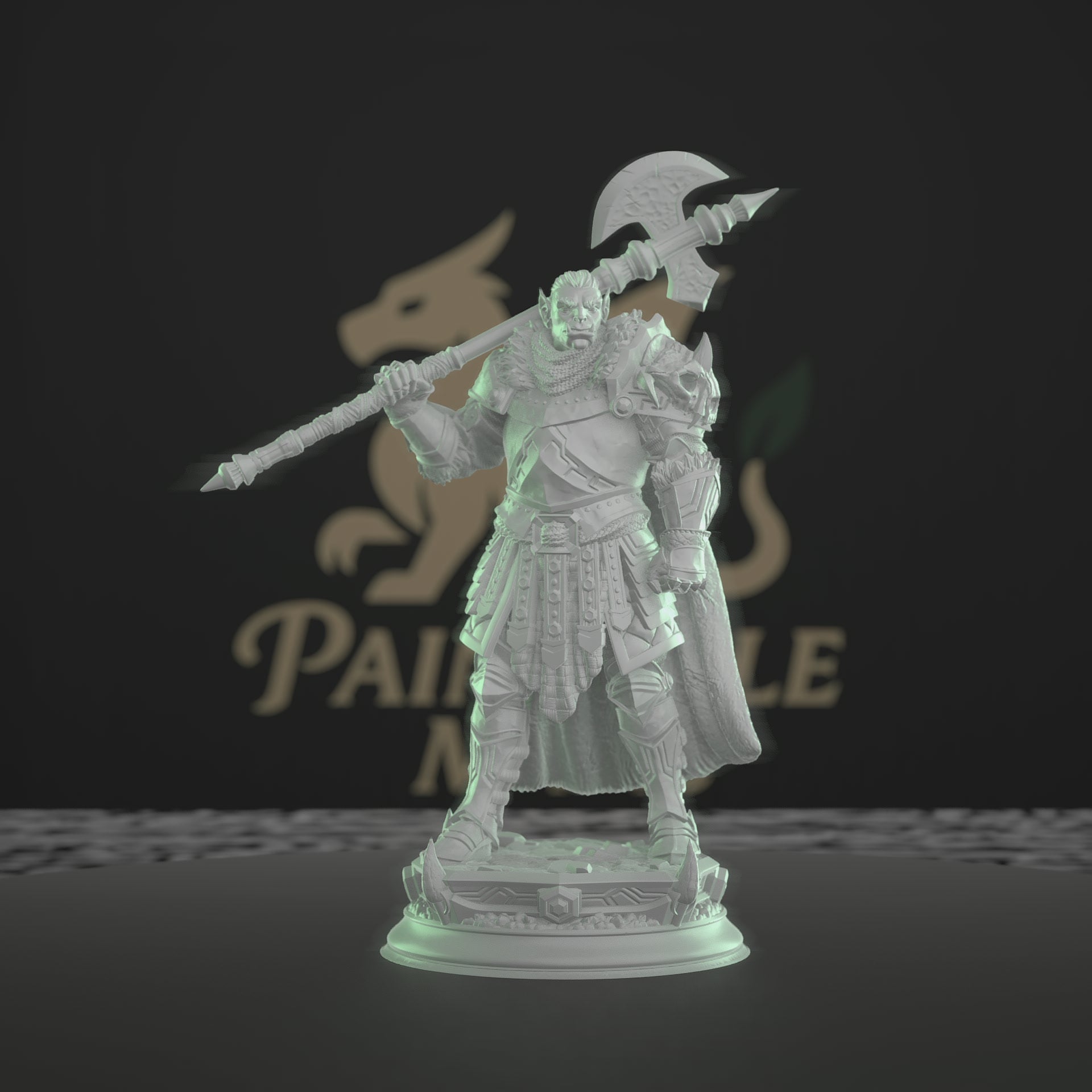 The Orc Chainbreaker Miniature presents a powerful figure wielding a massive double-bladed axe. Intricate details in the armor, featuring skull motifs and a flowing cape, emphasize its hero status on the tabletop. Ideal for Dungeons and Dragons and Pathfinder players, this model captures the essence of a noble warrior. With a menacing pose, it stands ready for painting and display in any RPG collection.