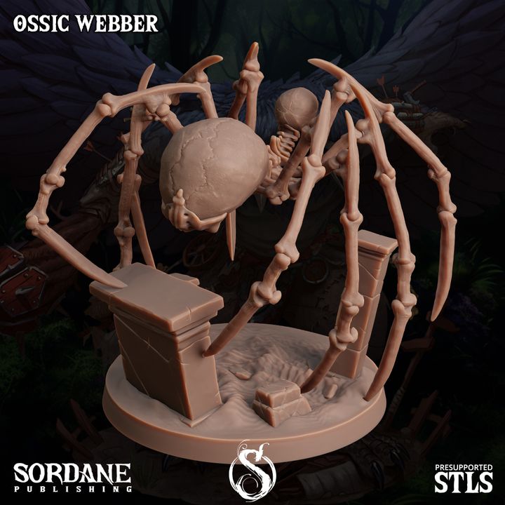 This model depicts the Ossic Webber, a fearsome arachnid creature constructed from bone. These creatures are often used to guard ancient tombs or crypts, adding a chilling presence to any setting. The intricate skeletal structure highlights its menacing design and stature.