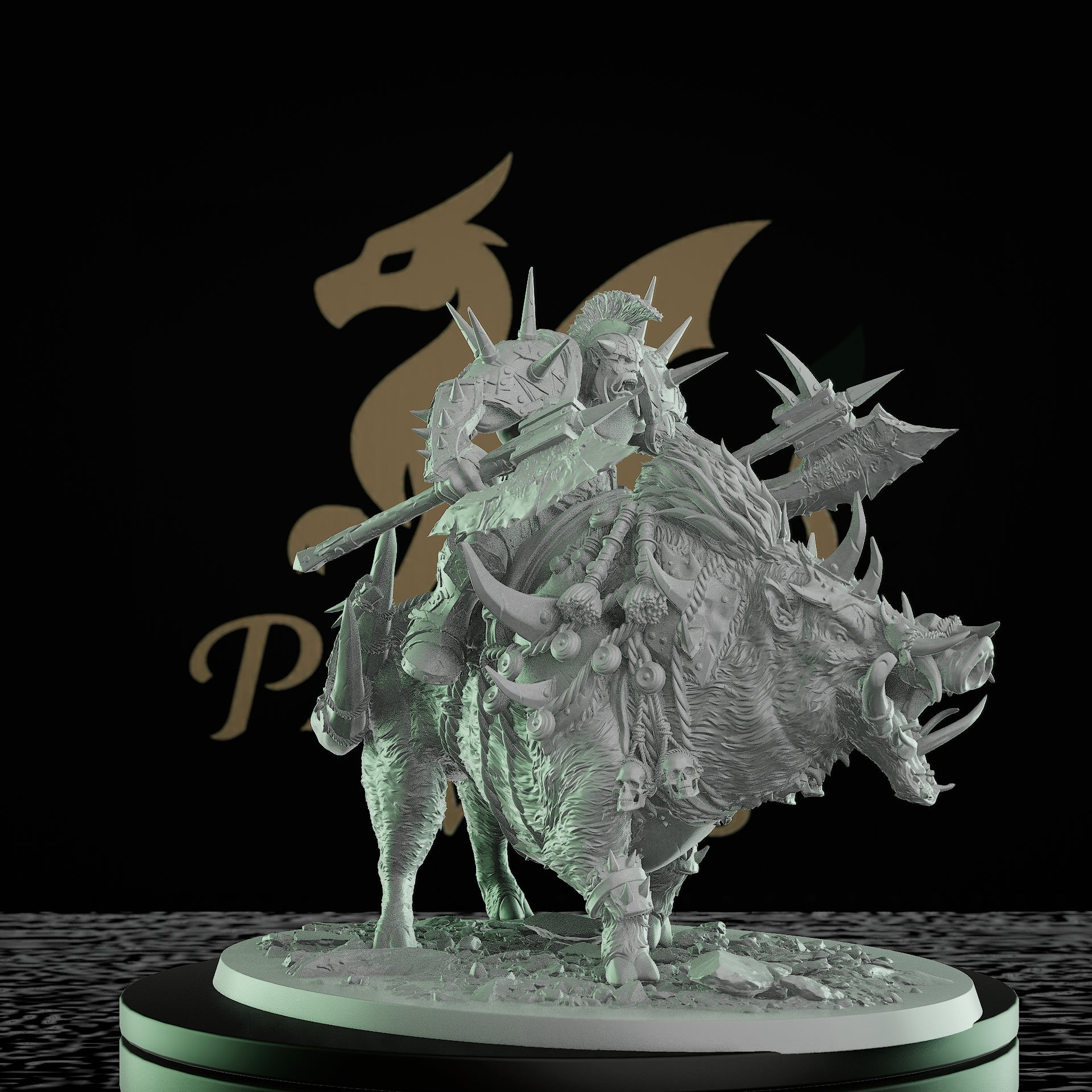 This impressive Orc Boar Rider miniature features a heavily armored orc mounted on a fearsome, spiked war boar, perfect for fantasy battles. The dynamic pose of the orc, ready for combat with a menacing weapon in hand, adds to the model's dramatic effect. Ideal for Dungeons and Dragons and other tabletop RPGs, this 3D printed model offers detailed craftsmanship for hobby painters. Standing at a significant height, it makes for a commanding presence in any fantasy miniatures collection.