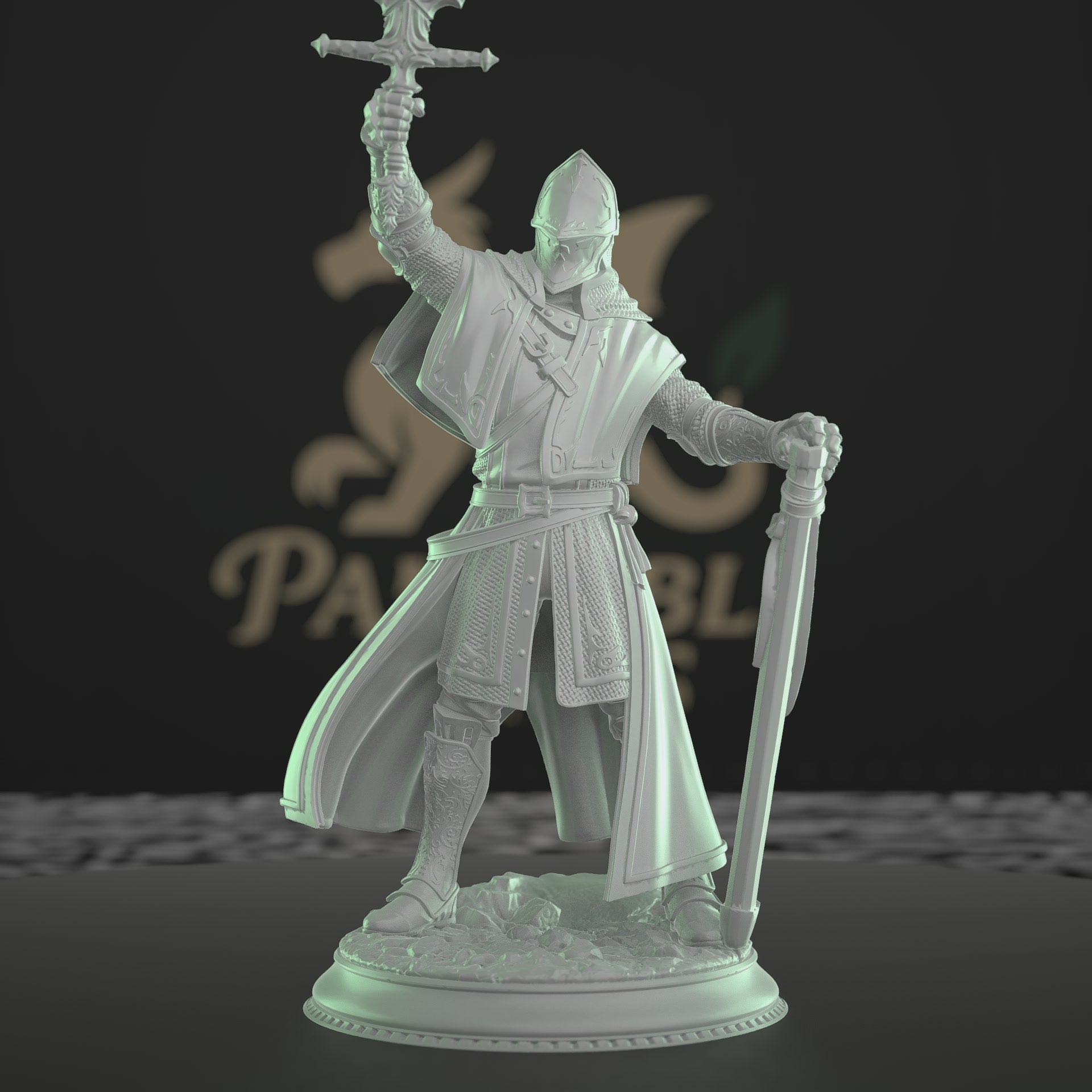 The Vicar of Grimhelm miniature depicts a heroic war priest raising a sword, exuding an aura of divine power. His detailed robes and armor enhance the model's presence, making it perfect for tabletop RPGs or display. This medium-sized model stands 73mm tall and sits on a 25mm base, showcasing intricate craftsmanship ideal for painting hobbyists. Add this dynamic figure to your collection for an inspiring character piece.