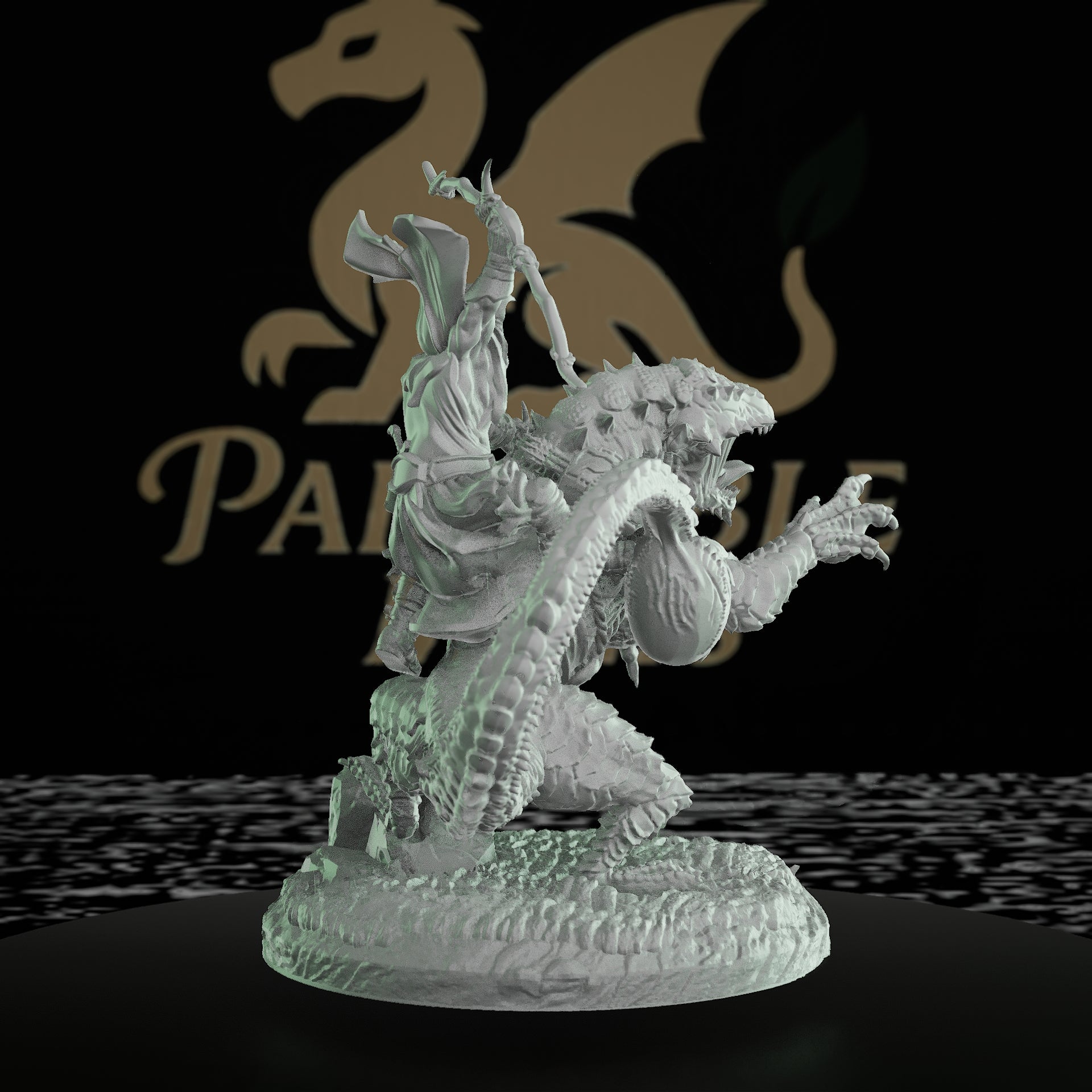Join the adventure with this Rekari Sand Drake, featuring a fierce Ekrothari Warrior perched atop. This highly detailed miniature captures the dynamic motion of the sand drake racing into battle, with the warrior ready to strike. Perfect for DnD and Pathfinder campaigns, this large-scale model is designed for hobbyists who enjoy painting and assembling detailed figures. Impress your gaming group with this intricately designed piece that adds excitement to any tabletop setting.