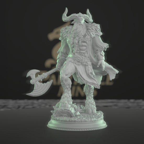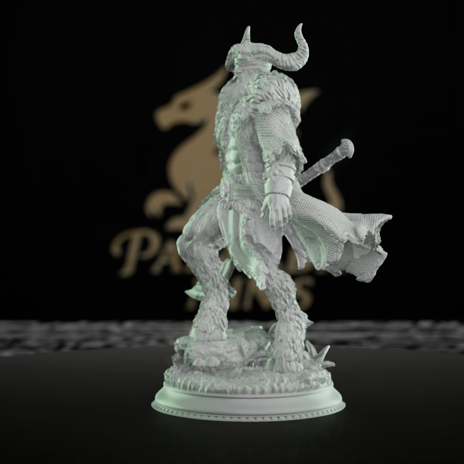 This satyr miniature, designed by DM Stash, depicts a rugged sellsword banished from the Feywild. Standing with a menacing stance, he wields a detailed axe and wears a fur-lined cloak, making it an ideal choice for D&D campaigns or painting projects. The model showcases intricate detailing, capturing the wild and chaotic nature of its character, Jonah. Perfect for hobbyists seeking high-quality, immersive figures for their tabletop adventures.