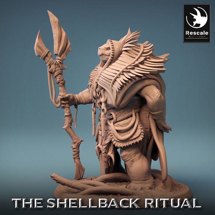 This model depicts a ShellBack Shaman, a turtle-like humanoid known in fantasy realms as a wise spellcaster. Shaman figures often wield potent elemental magic, drawing power from their deep connection to nature. The intricate staff and detailed robes emphasize the mystical aura of this character.