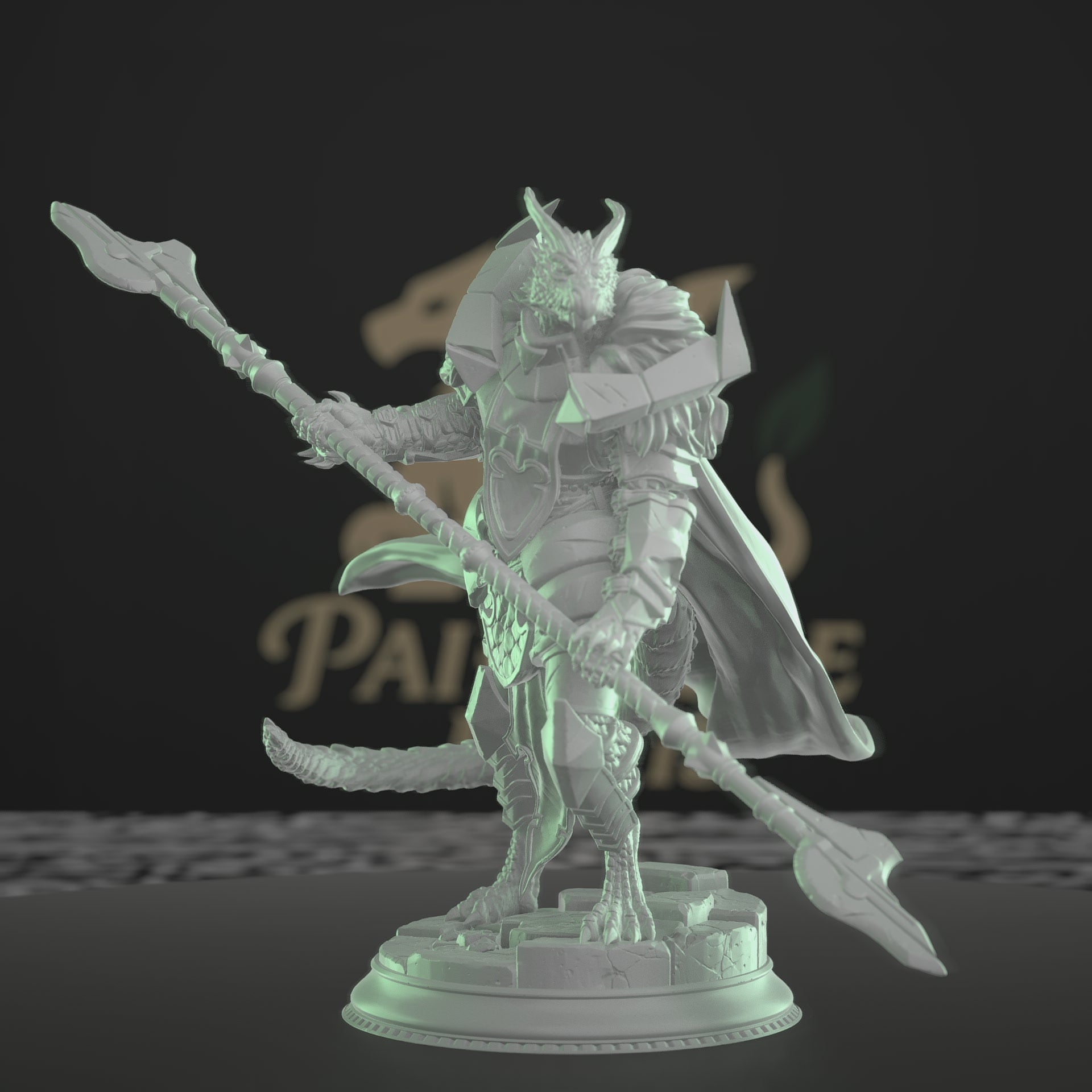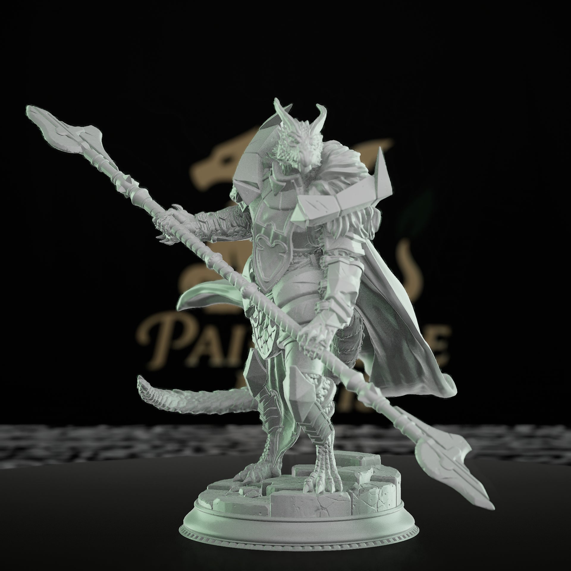 A majestic Silver Dragonkin warrior miniature, capturing the essence of justice and righteous dominion. This model depicts Apokris, a powerful and seasoned fighter from Azmordion, wielding a massive spear. Ideal for D&D and Pathfinder enthusiasts, this miniature displays intricate armor and dragon-like features. Perfect for painting hobbyists looking for detailed, high-quality miniatures for their tabletop games.