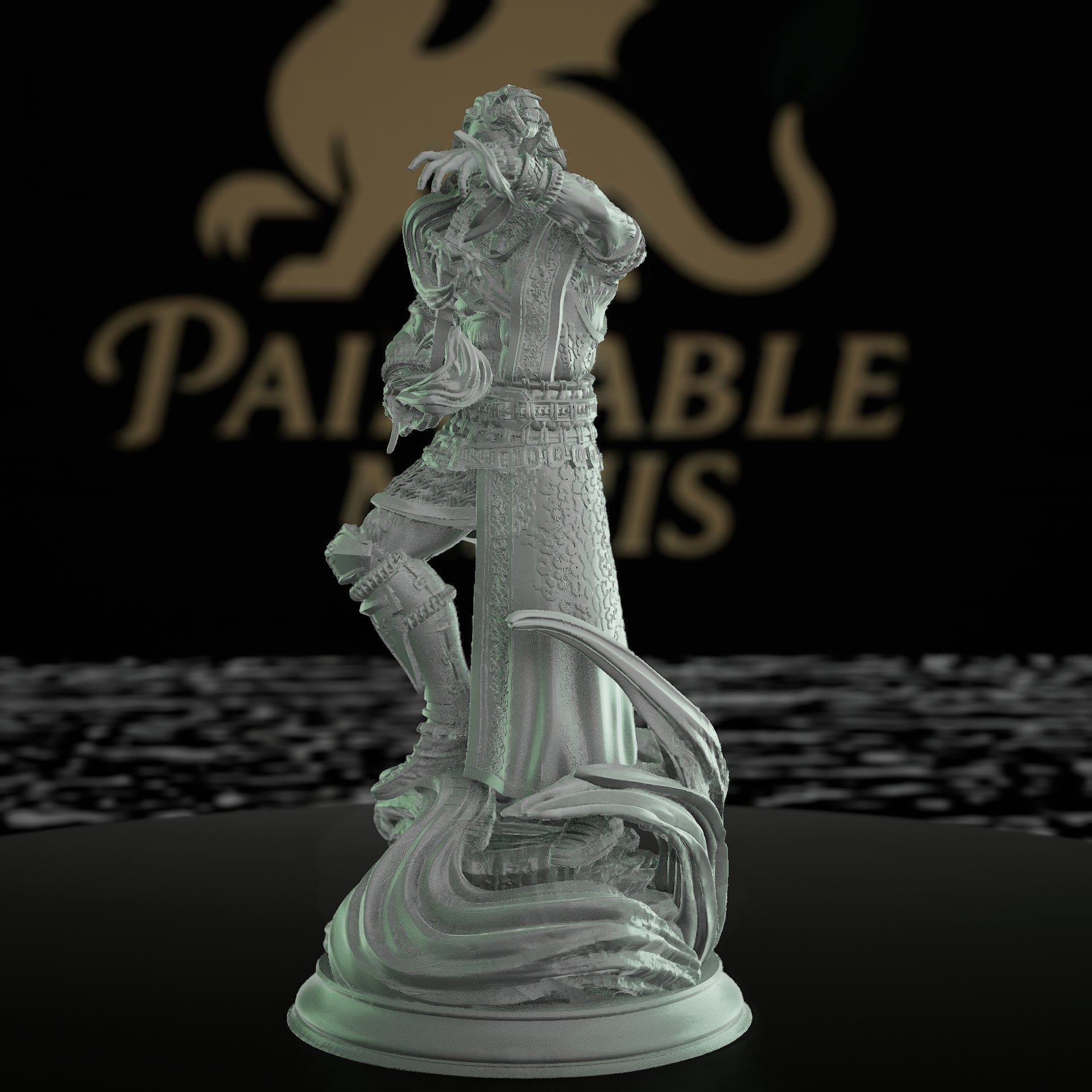 Heron, the infernal bloodline sorcerer, stands firmly on a dynamic, wave-like base. His intricate outfit showcases fine detailing, perfect for painters who enjoy highlighting texture and fabric. His confident pose and expressive face capture the character's internal conflict, ideal for storytelling on tabletop adventures. This medium-sized model is a fantastic addition for role-playing gamers and collectors looking for a unique figure with a compelling backstory.