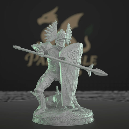 An elite knight miniature, showcasing exquisite armor details, perfect for D&D and Pathfinder campaigns. The model features intricate shield and sword elements, designed by DM Stash. Standing firm on a rocky base, this figure embodies the valor and duty of a royal bodyguard. Ideal for tabletop RPGs and as a highlight piece for hobbyist painters.