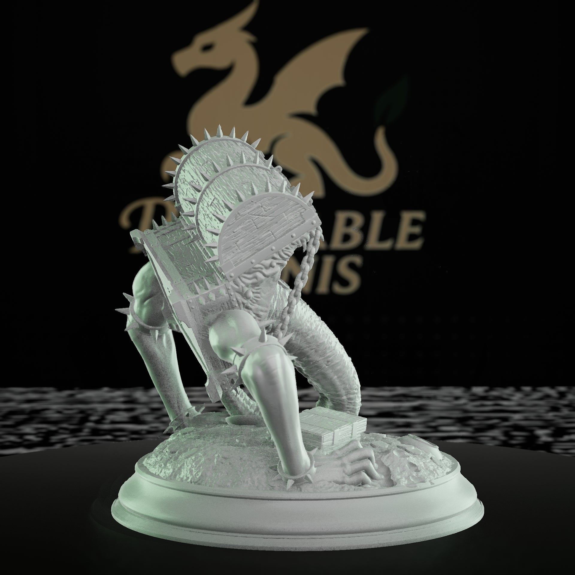 This mimic miniature captures the surprise and danger lurking in dungeons with its detailed mimicry of a treasure chest. The large tongue and menacing teeth highlight the creature's predatory nature, making it a unique addition to any RPG tabletop scene. Its intricately sculpted features make it perfect for hobbyist painters looking to create a captivating display piece. Designed by DM Stash, this miniature is a must-have for collectors and adventurers alike.