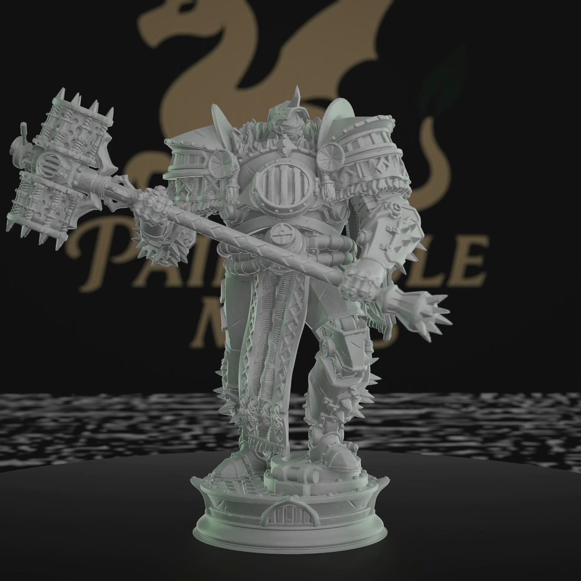 This imposing Soulforged Warrior Miniature is crafted with intricate mechanical and ornate armor details, perfect for tabletop RPG games and display. Designed by DM Stash, the model captures a formidable presence, showcasing an array of spiked and gears that add a robust and fearsome look. Standing at approximately 52mm, it's a medium-sized figure on a 25mm base, offering a blend of mechanical and aesthetic appeal. Ideal for hobbyists, this miniature offers a unique character for D&D and Pathfinder campaigns.