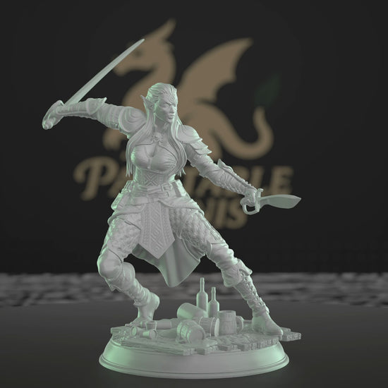 Hali, the Water Elemi, features intricate details, portraying her readiness for combat. With a flowing robe and gripping dual swords, she stands poised on a base scattered with tavern elements, embodying her tavern-queen past. The model captures dynamic motion and precision, ideal for tabletop RPG gamers and painters. Made for hobbyists, this miniature enhances any role-playing or display collection.