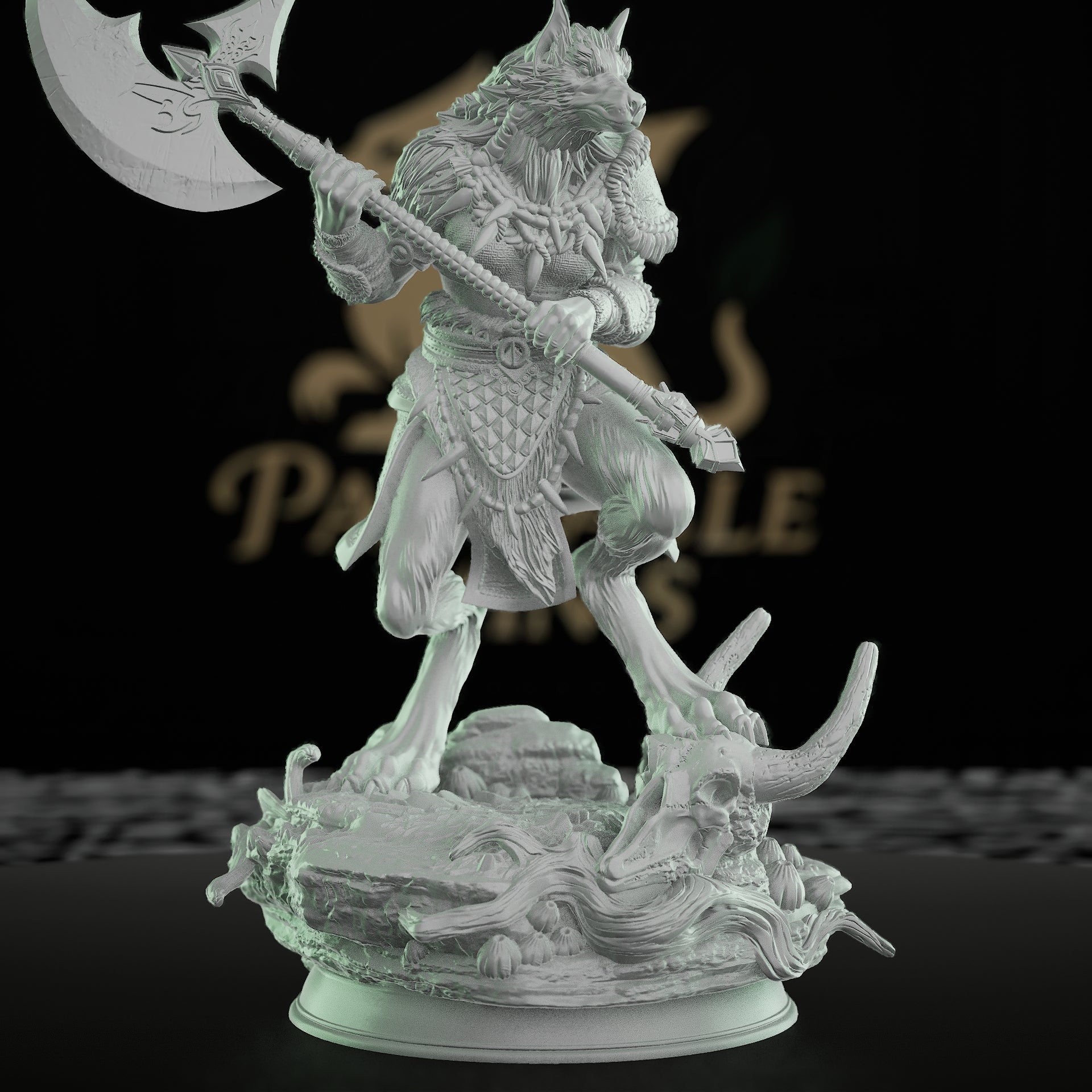 A striking werewolf miniature, this model captures the essence of a lycanthropic warrior in detailed armor, wielding an impressive axe. Perfect for Dungeons & Dragons or Pathfinder campaigns, this medium-sized figure stands ready to add character and depth to your adventures. Crafted for hobbyist painters, the model features intricate details ideal for painting and display. Enhance your tabletop experience with this versatile model suitable for both gameplay and collection.